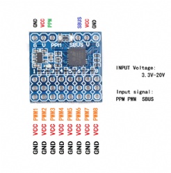 When any one or more channels of the 1-8 channel input PWM signals, the corresponding PPM channel outputs the PPM signal, and the SBUS channel outputs the SBUS signal.