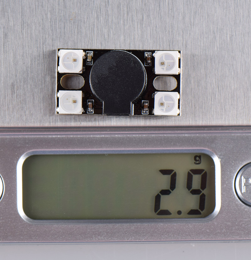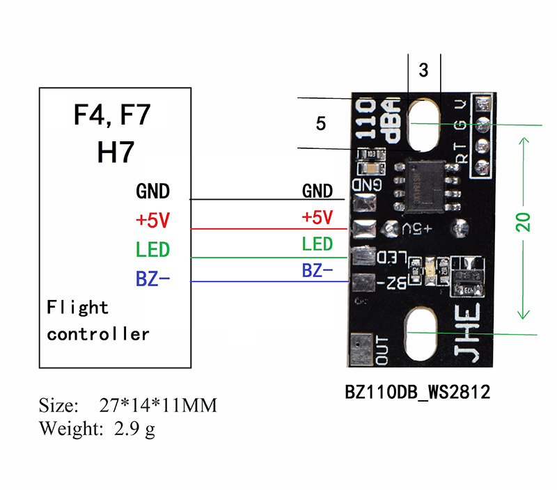 BZ110DB supports mainstream traversal aircraft flight control, such as Betaflight and INAV firmware for F4, F7, H7, etc. Equipped with a high-power buzzer, the maximum sound can reach around 110 decibels, powered by 5V voltage, and comes with 4 WS2812 LEDs.